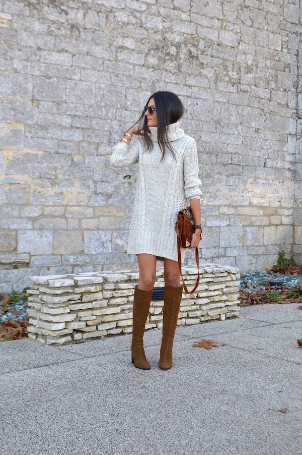 - Robe pull en laine + collants épais, associée à des bottes hautes et un manteau long pour une allure chic et cosy.