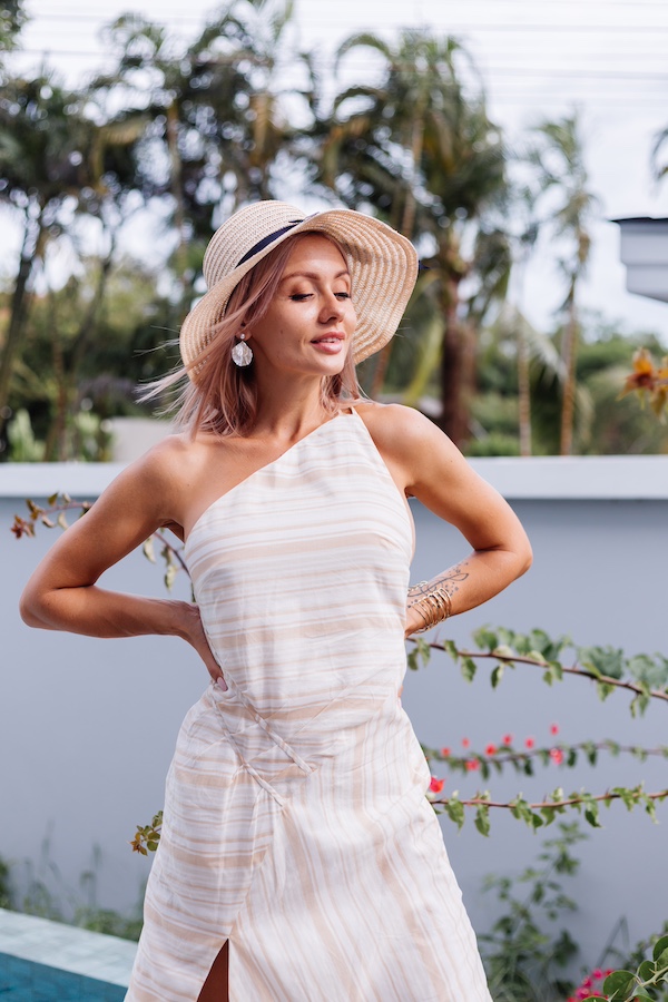 - Robe fluide en mousseline ou en lin, parfaite avec des sandales plates et un petit sac à main en osier.