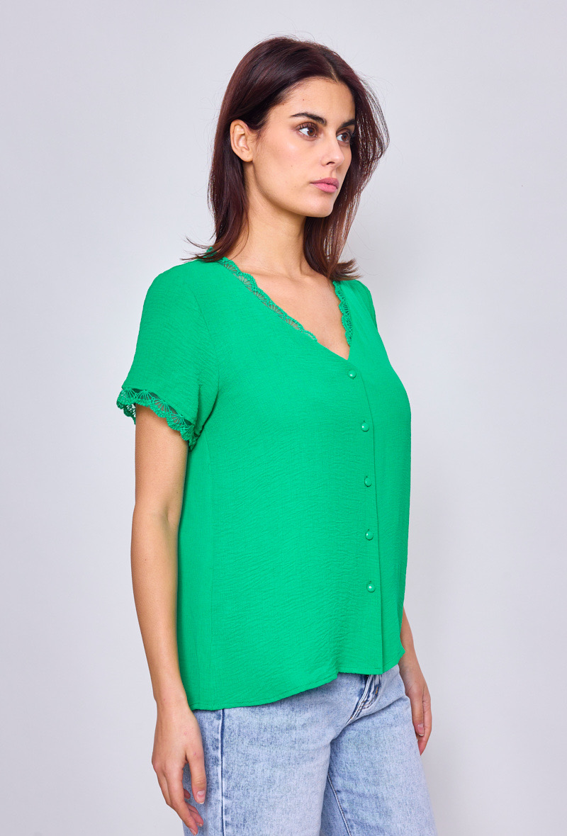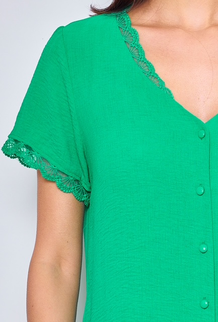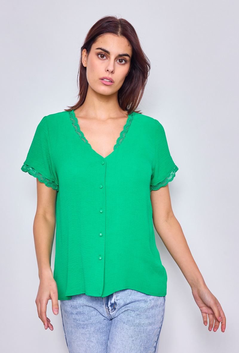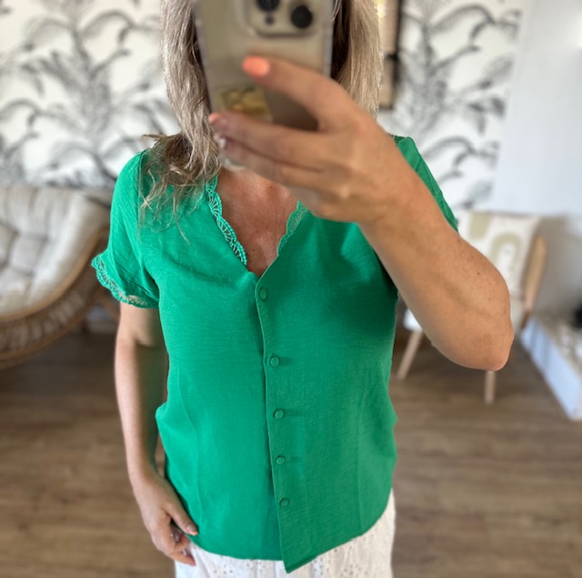 Cette blouse manches courtes verte col V séduit par son design raffiné et féminin. Son col en V délicatement bordé de dentelle apporte une touche d’élégance subtile, tandis que ses boutons recouverts ajoutent une note sophistiquée. Une pièce parfaite pour un style chic et intemporel.