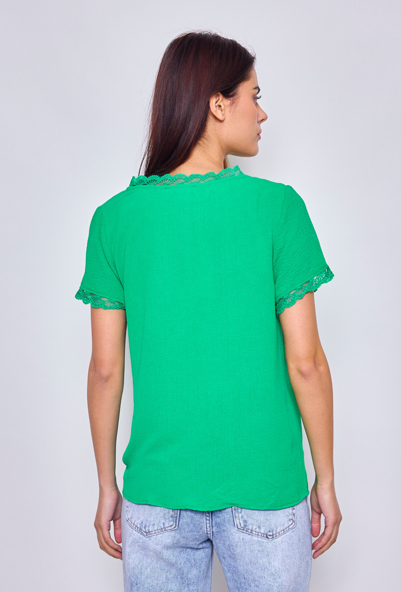 Associez cette blouse verte à un jean taille haute et des baskets blanches pour un look décontracté mais tendance. Son col V féminin et sa dentelle délicate apporteront une touche de sophistication à une tenue simple.