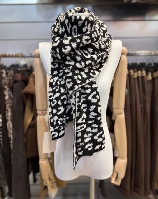 Echarpe femme douce et chaude en maille jacquard, avec un motif léopard blanc sur fond noir.
