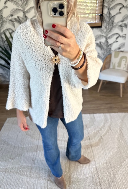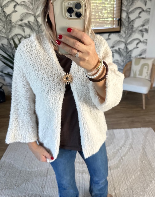 Ce gilet en tissu bouclette femme allie douceur, confort et élégance.