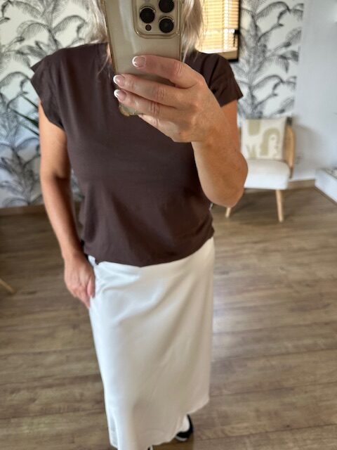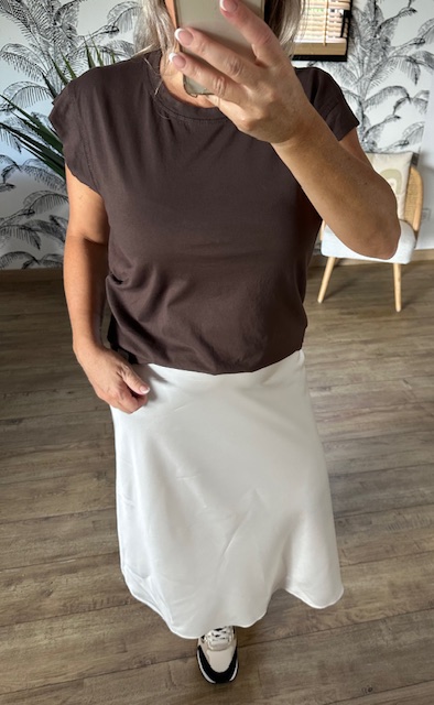 Associe ta jupe longue satinée beige à un t-shirt basique (comme un noir ou blanc) et à une paire de baskets. Résultat : une tenue moderne et décontractée, parfaite pour une journée en ville ou un brunch entre copines.