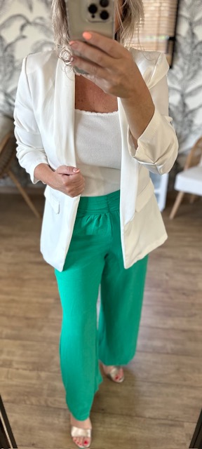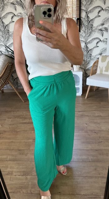 Associe ce pantalon vert à un haut blanc près du corps et à une paire de sandales plates ou à talons. Le contraste des couleurs crée un look lumineux et frais, idéal pour l’été.