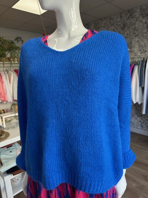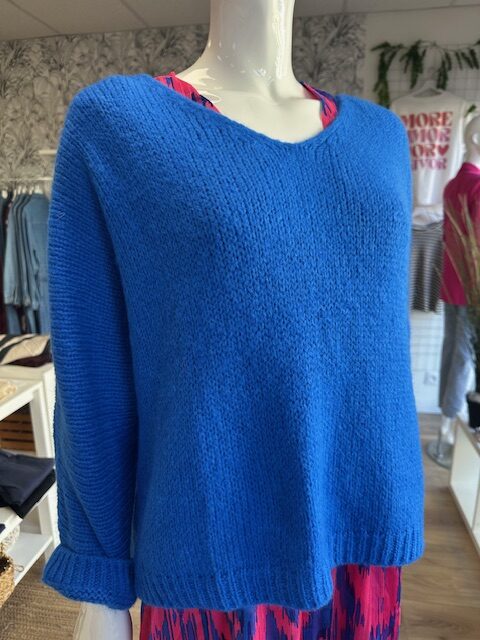 Pull femme en maille douce et légère, au coloris bleu électrique, parfait pour apporter une touche de fraîcheur à votre dressing.