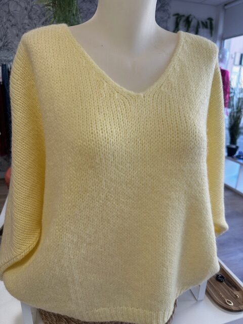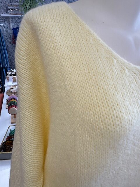 Pull femme en maille douce et légère, au coloris jaune pastel lumineux, parfait pour apporter une touche de fraîcheur à votre dressing.