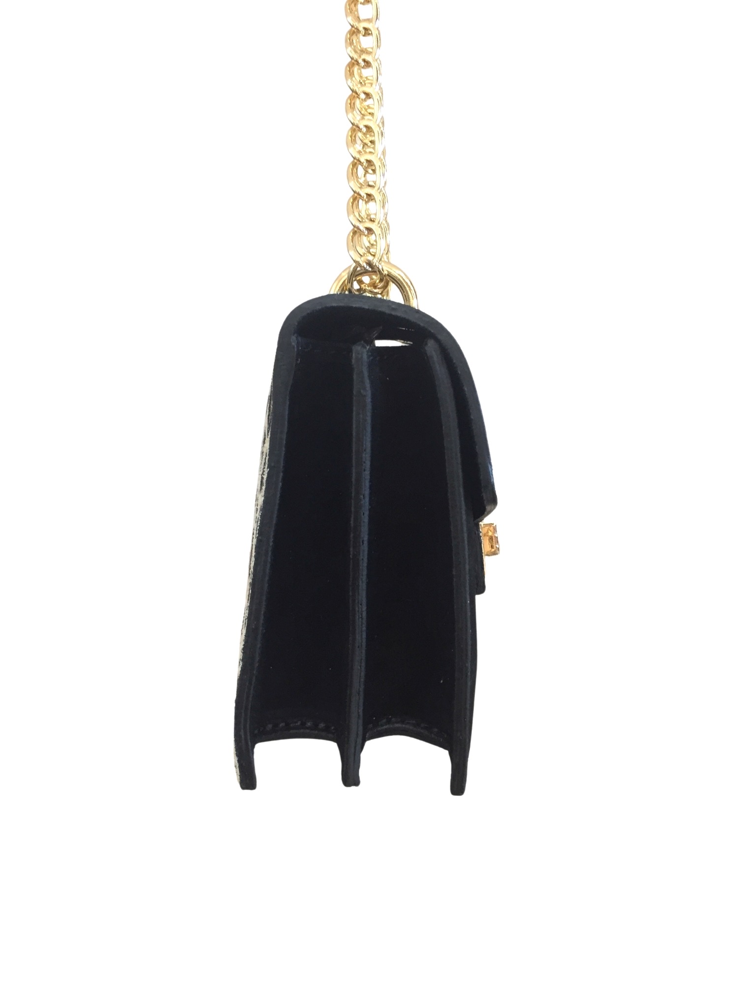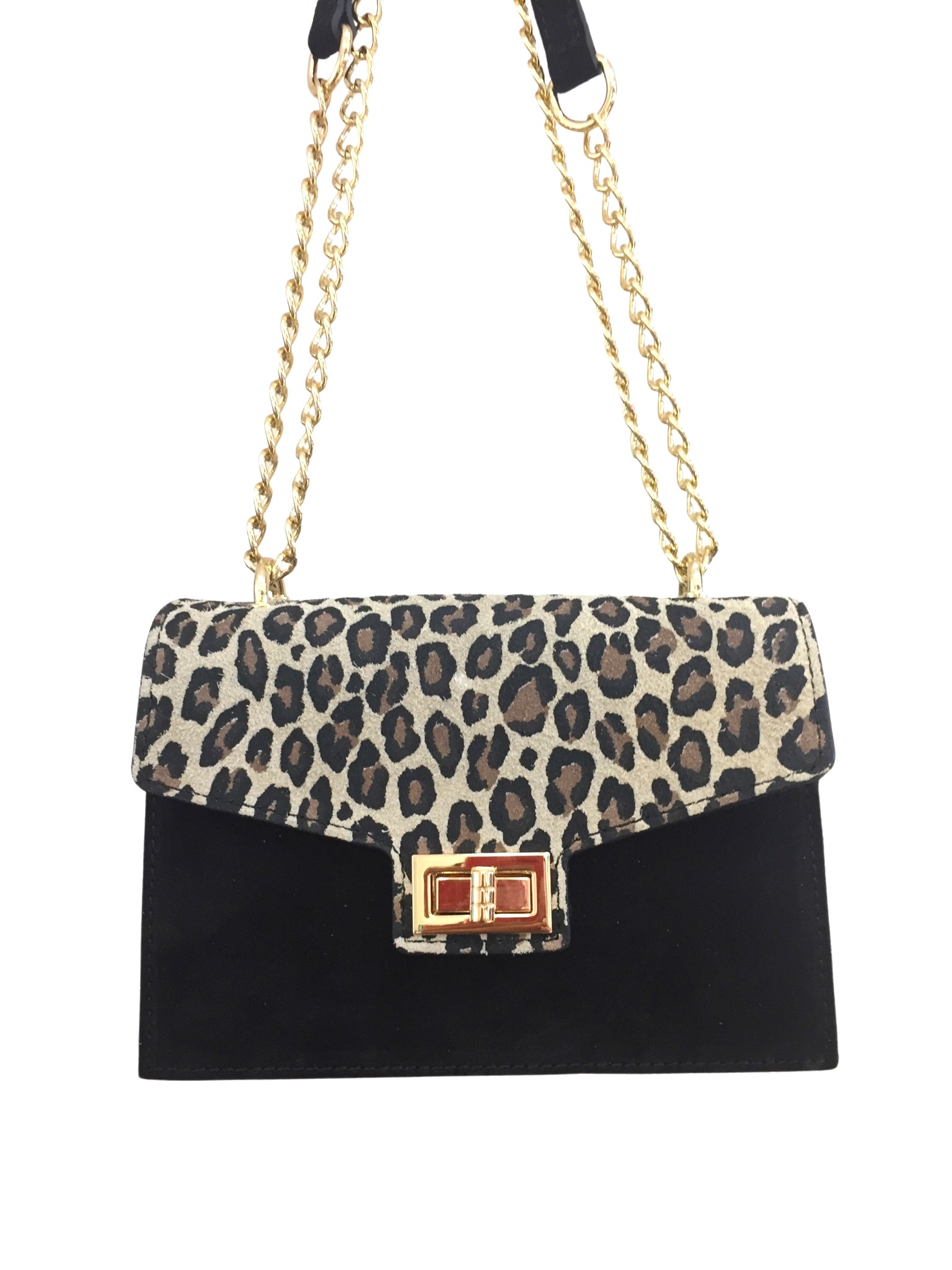 Son rabat imprimé fauve contraste à merveille avec le corps en suédine noire, pour un rendu à la fois chic et sauvage.