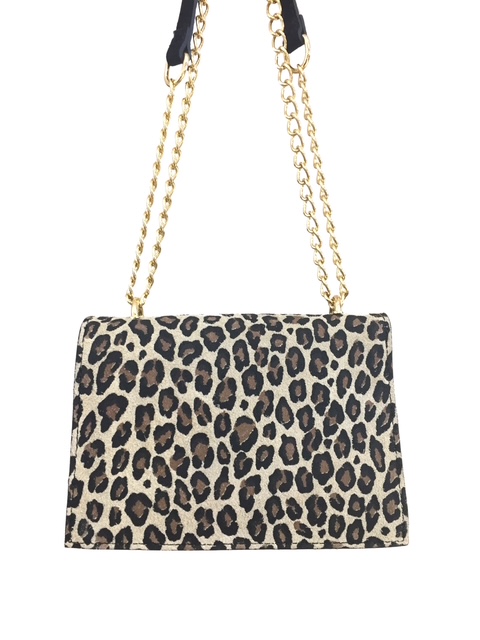 Porte ce sac avec un jean taille haute, un tee-shirt blanc et une veste noire pour un look simple boosté par une touche léopard. La chaîne dorée vient rehausser l’ensemble avec subtilité.