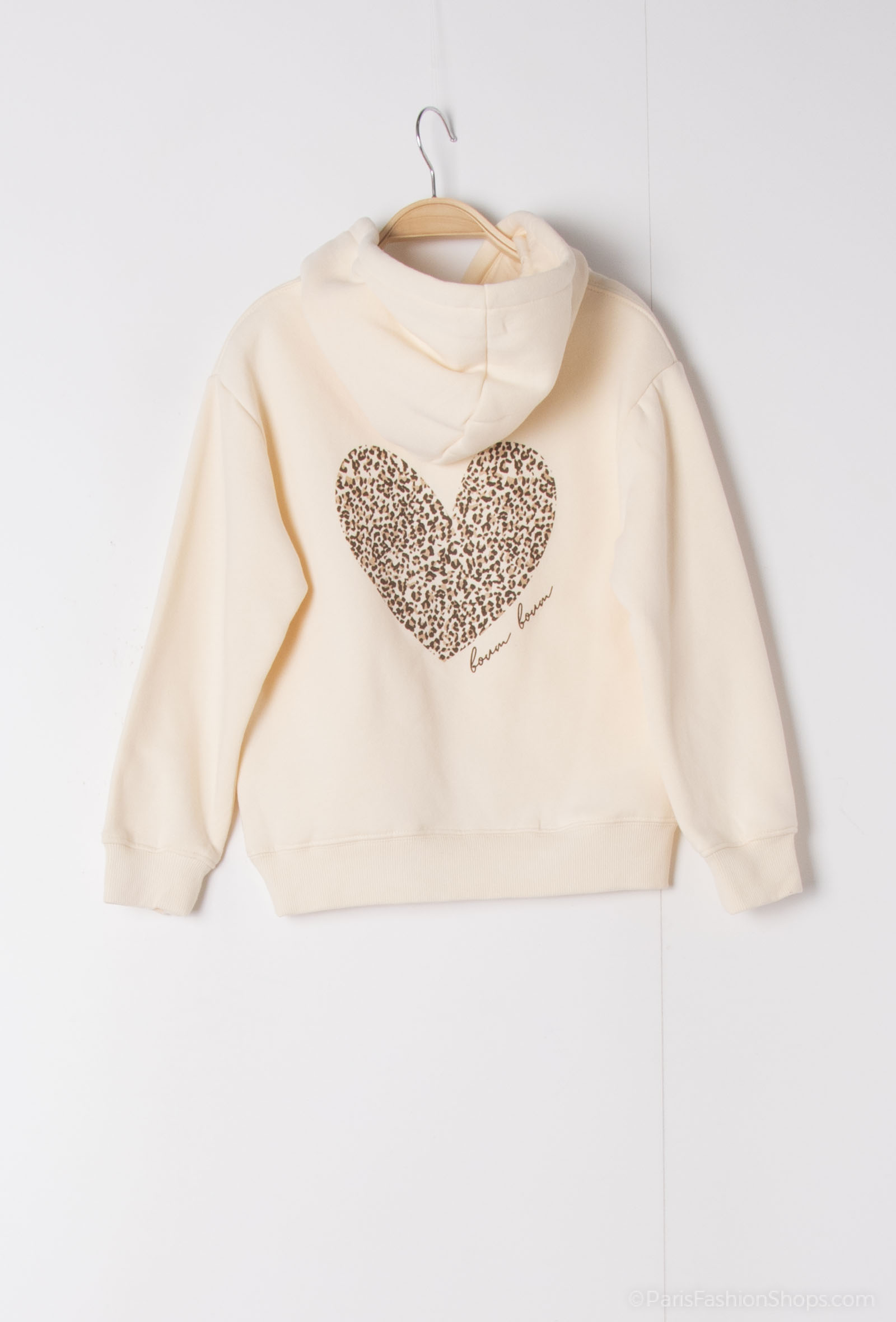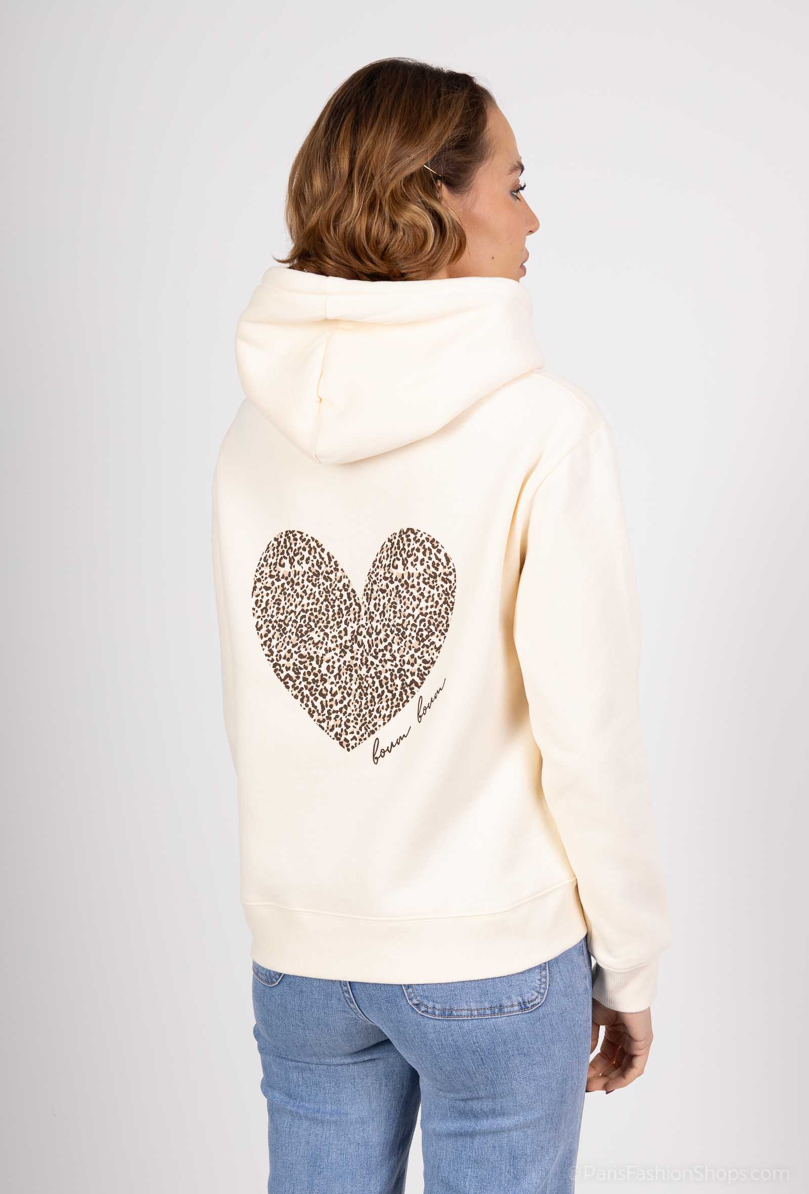 Ce sweat à capuche beige se distingue par un grand cœur imprimé léopard dans le dos, accompagné de l’inscription « boum boum » en calligraphie fine. Une pièce forte et stylée, idéale pour les femmes qui aiment affirmer leur look tout en restant confortables.