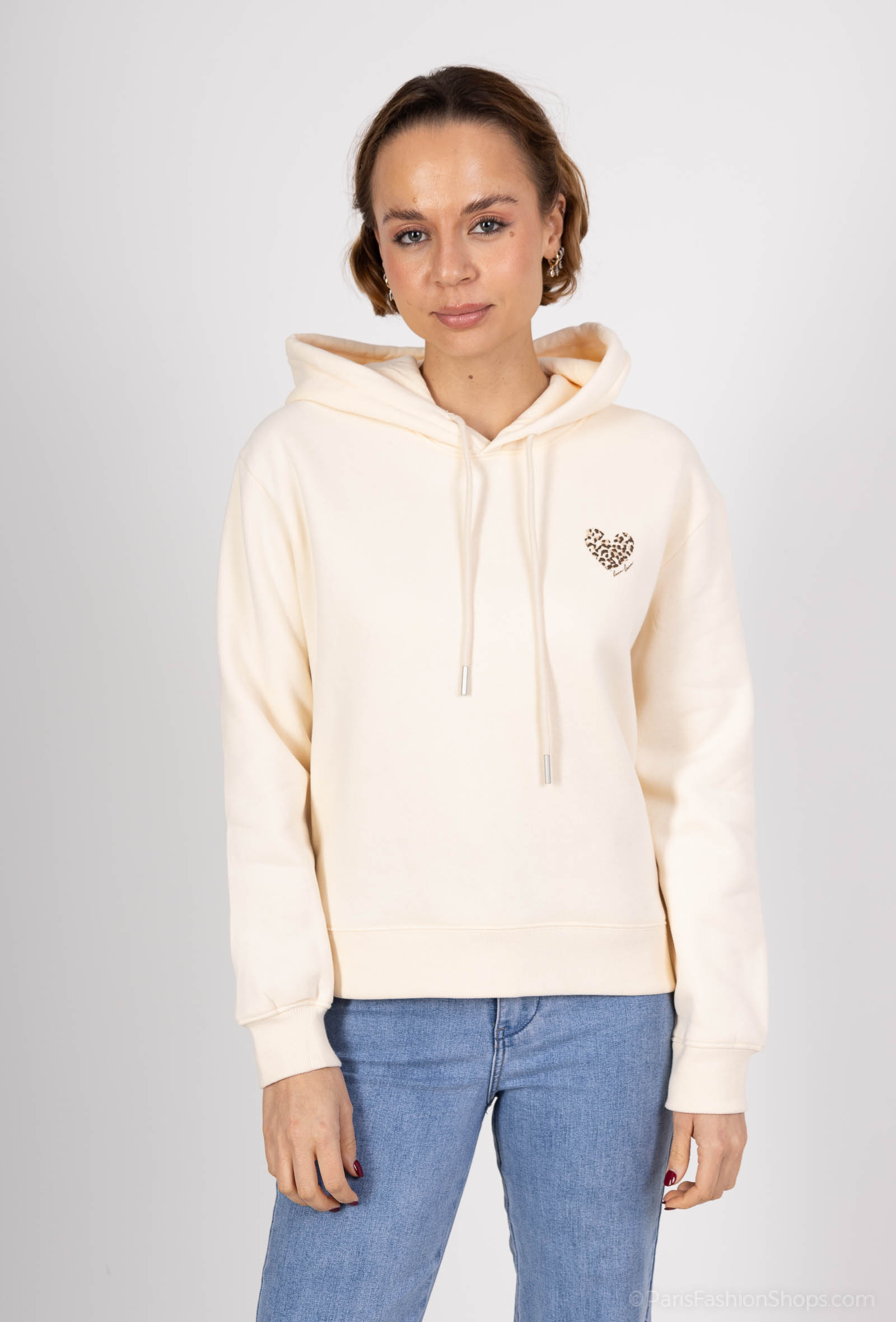 Craquez pour ce sweat à capuche beige au style unique, sublimé par un grand coeur imprimé léopard.