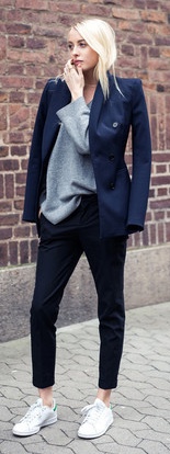 Une veste bleu marine portée sur un pantalon gris perle crée un look professionnel et élégant. Pour une tenue plus décontractée, utilise un pull gris clair avec une jupe fluide bleu ciel.